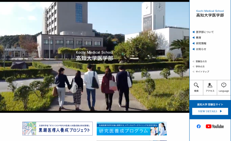 高知大学医学部では、高知医科大学の建学の精神を受け継いだ教育理念を有しており、他人を思いやる利他の心を持って、人として正しい道を歩み(敬天愛人)、真実を大切にしつつも、新しいものを生み出そうと努める(真理の探究)という確固たる姿勢で、生涯に亘って医学を学び、医療を実践できる人間に成長して頂けるように、多様性かつ専門性に富む特色ある医学教育プログラムが用意されています。特に、先端医療学推進センターによる「先端医療学コース」、および家庭医療学講座による「家庭医道場」、これらは高知大学医学部が新しく始めた、言わば高知ブランドと言える医学教育プログラムであり、地域のみならず全国的にも注目を浴びています。「先端医療学コース」では、最先端研究の早期体験、アクティブラーニング、異年次教育を特徴として、医学研究マインドを育成します。また、「家庭医道場」では、医学生や看護学生が地域住民や患者さん、さらには地域医療を支える医療人とも交流し実践的に地域医療を学びます。このように、高知大学医学部では、先端医学と地域医療という、社会が求める2つの大きなテーマを中心に、先進的な医学教育を推進しています。学生も教職員も、ともにワクワクできる学びの場、高知大学医学部は、これからも次世代の医学・看護学を開拓し牽引する高知ブランドの医師、看護師、医学研究者、医学教育者を育成し、高知から世界に向けて輩出していきます。
