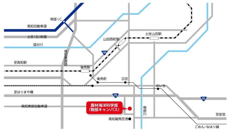 本学「朝倉」「岡豊」「物部」キャンパスまでの交通アクセスをご案内いたします。