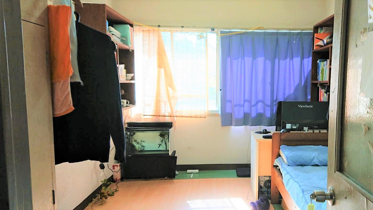 (居室) ベッド、机、椅子、書棚、ロッカー、ヒーター、扇風機、インターネットは居室で使用できます(た
