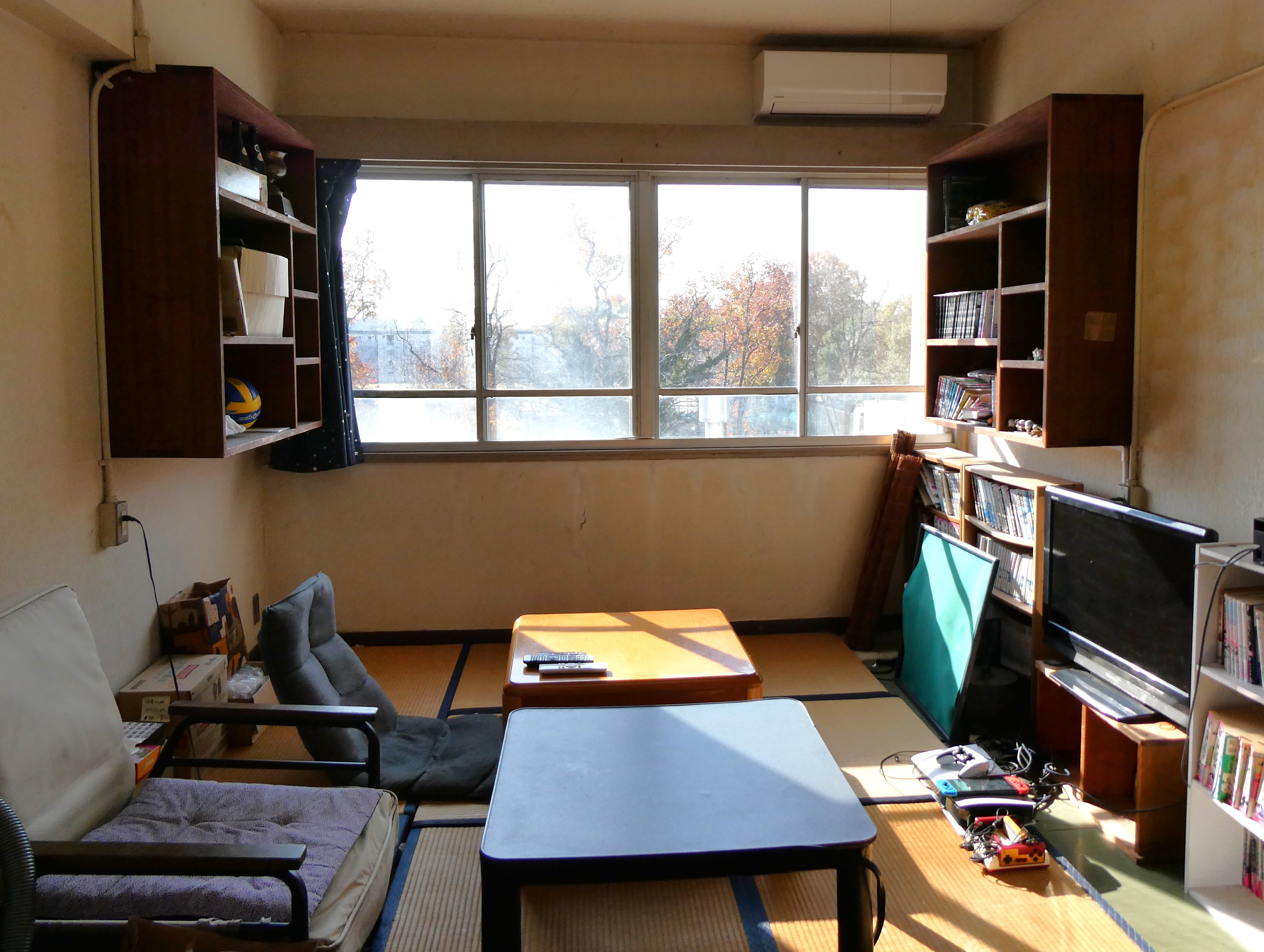 (居室) 机、椅子、書棚、ロッカー、コタツ、扇風機。インターネットは居室で使用できます。