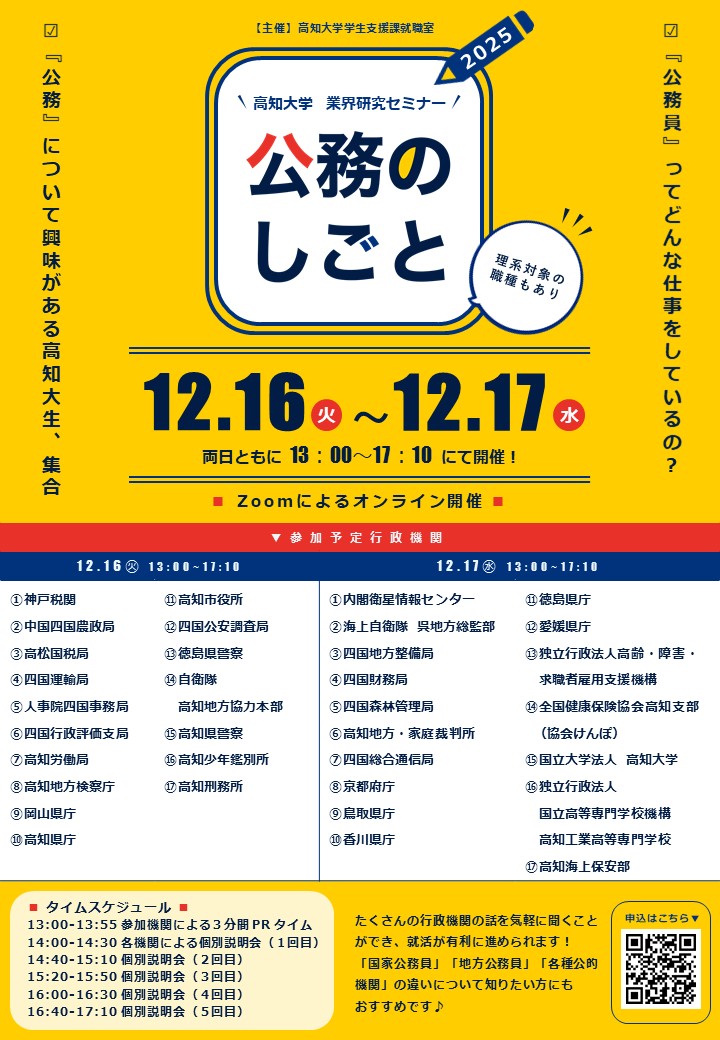 - 11月27日【公務員志願者・全学年向け】 12月16日・17日 業界研究セミナー「公務のしごと」開催について