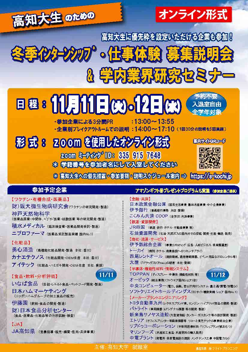 公開日 2025年10月6日 \冬季のインターンシップ&仕事体験を見つけよう!/ オンラインで「冬季インターンシップ・仕事体験募集説明会&学内業界研究セミナー」を開催します! 開催日:11月11日(火)・12日(水) 開催形式:オンライン(Zoom) 対象:全学年(業界・企業研究に興味がある高知大学生) 詳細:KULASにて案内掲載予定 ✅ 参加予約不要! ✅ 好きな時間に何度でも入退室OK! ✅ 2日間で約30社が参加予定!企業のリアルな話が聞けるチャンス!