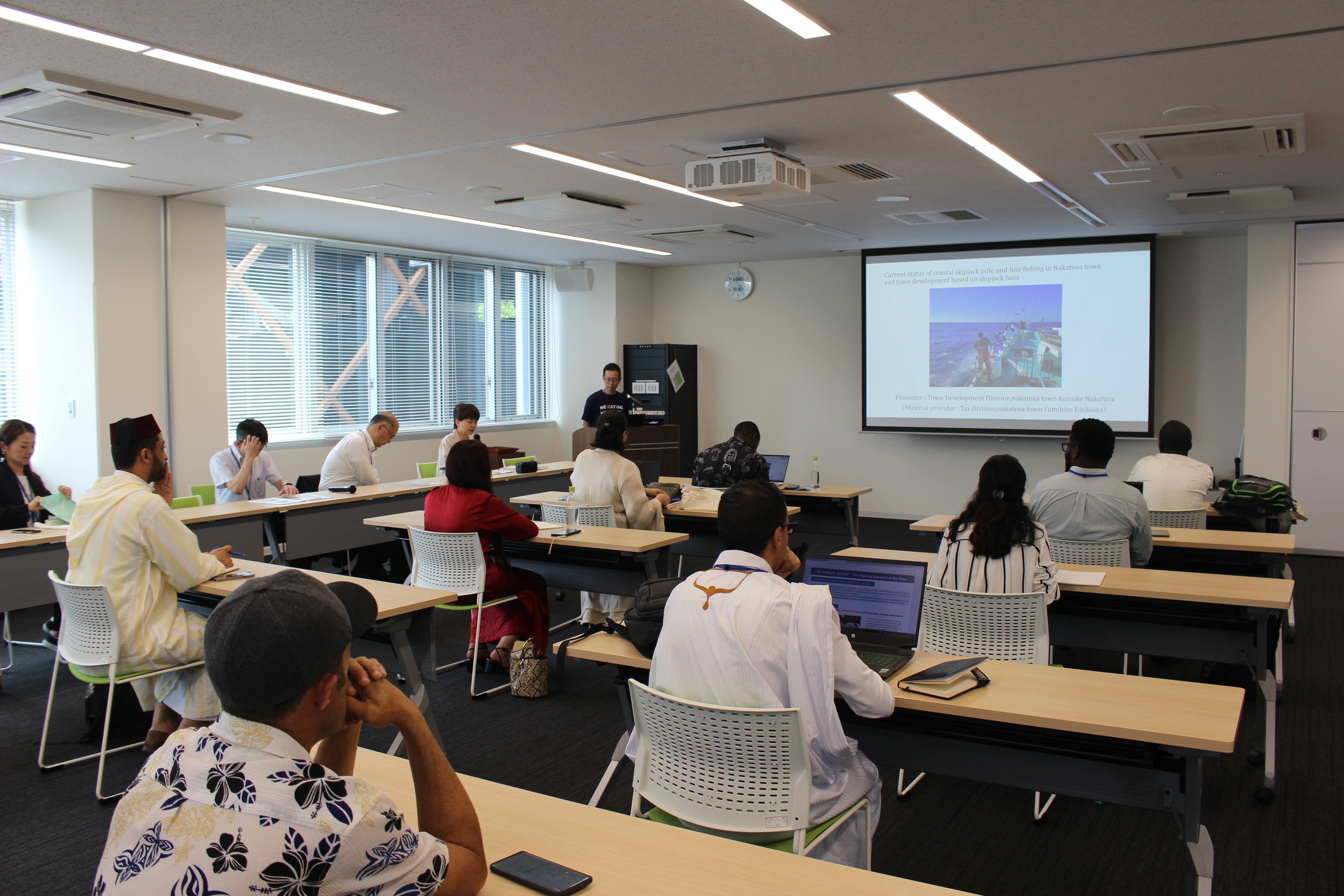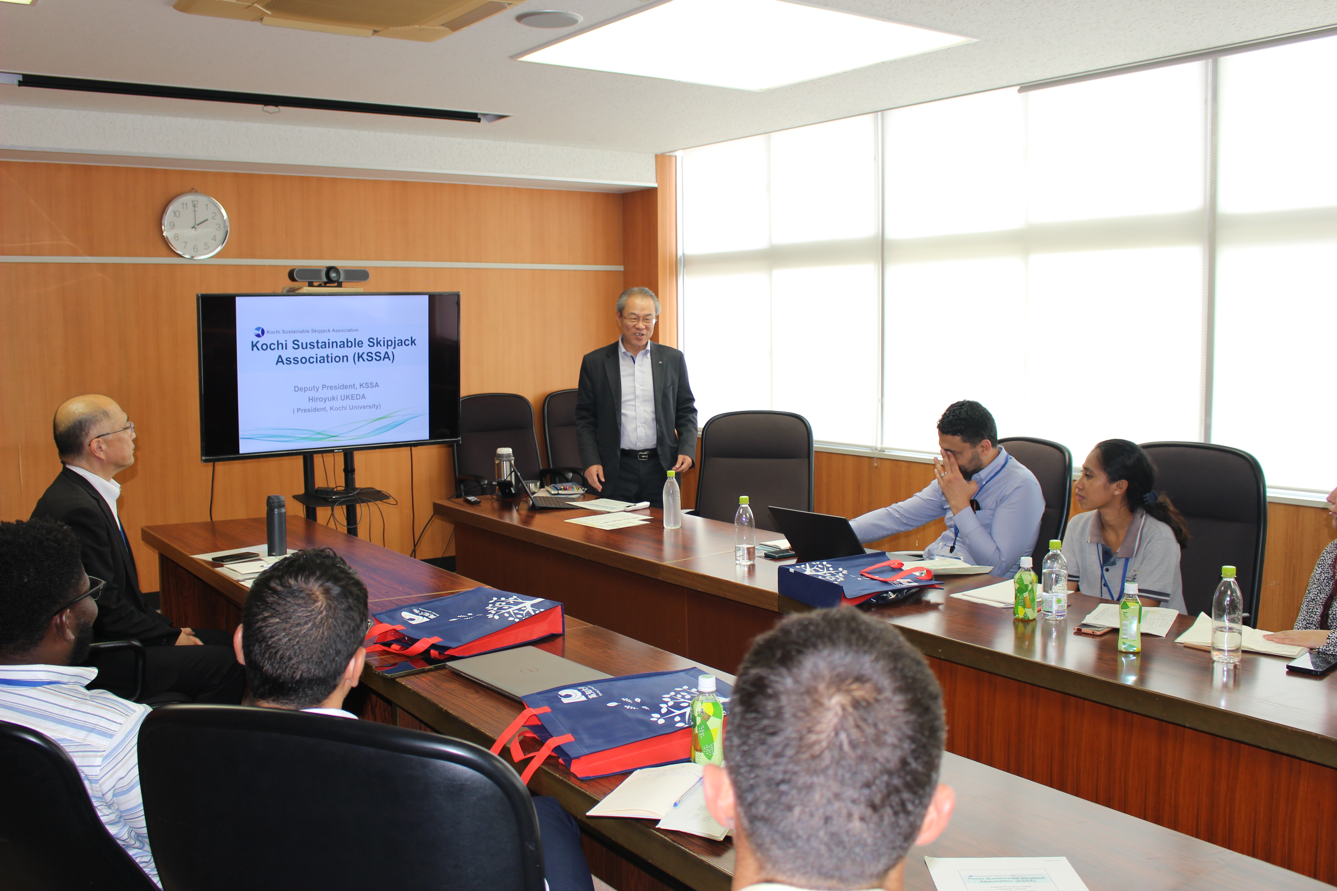 本研修では、東ティモール、ナウル、ジャマイカ、モロッコ、ギニアビサウ、モーリタニア、セネガルの行政官他、7ヵ国9名に対し、国や高知県の産学官が主導して進めているカツオ資源の持続的な管理と利用を中心とする様々な取組や高知で活躍する水産関連企業を紹介しました。