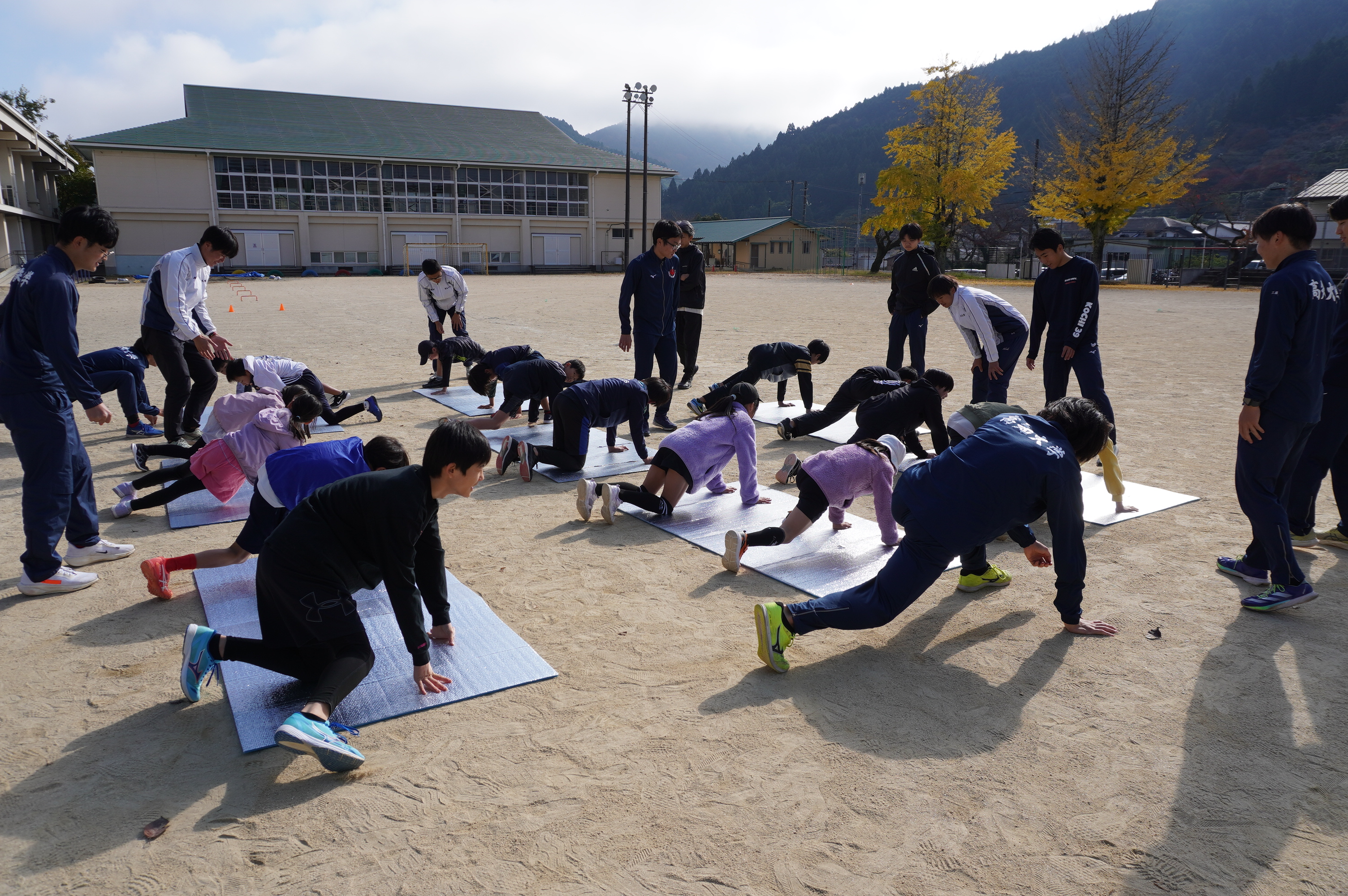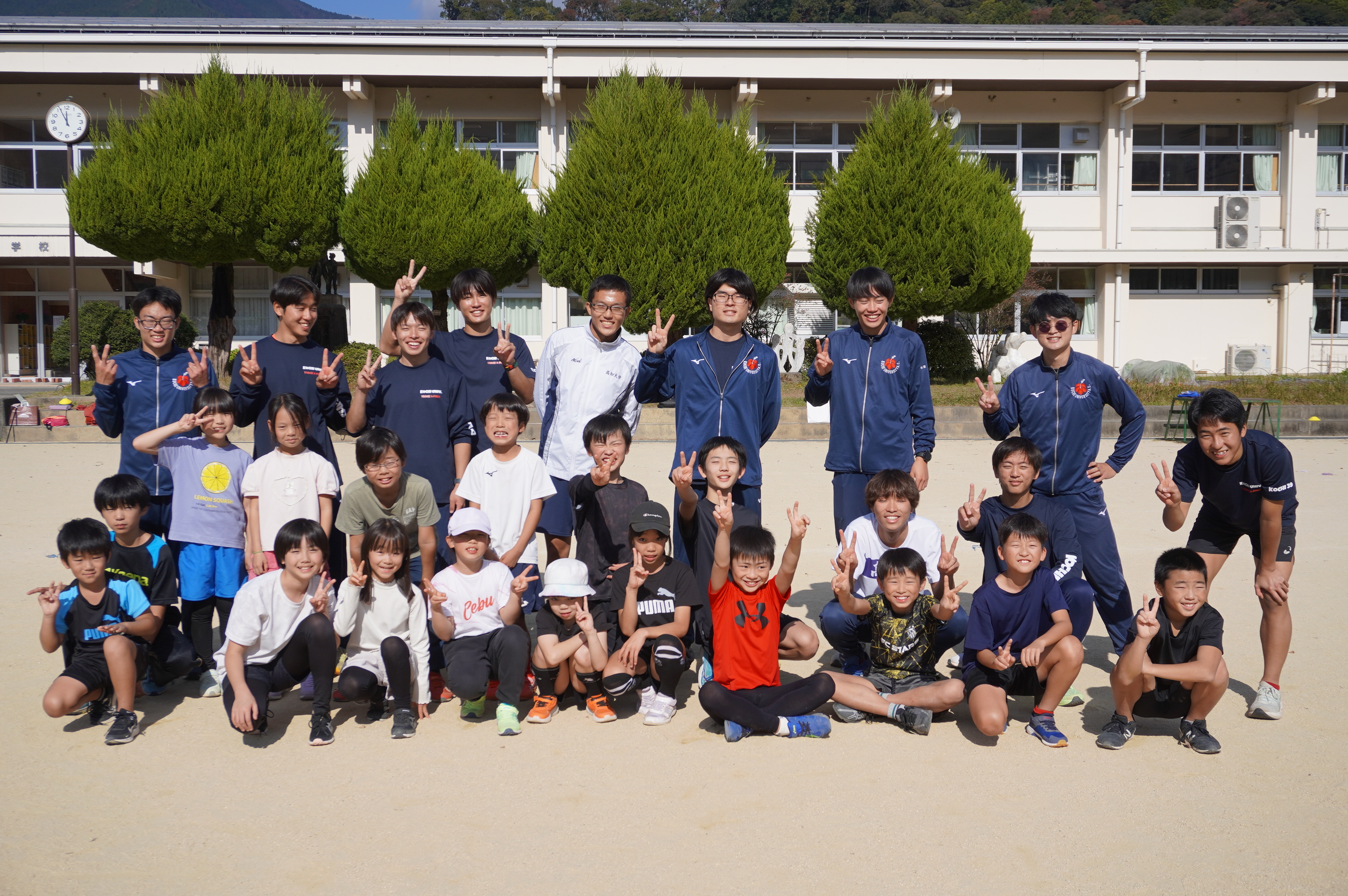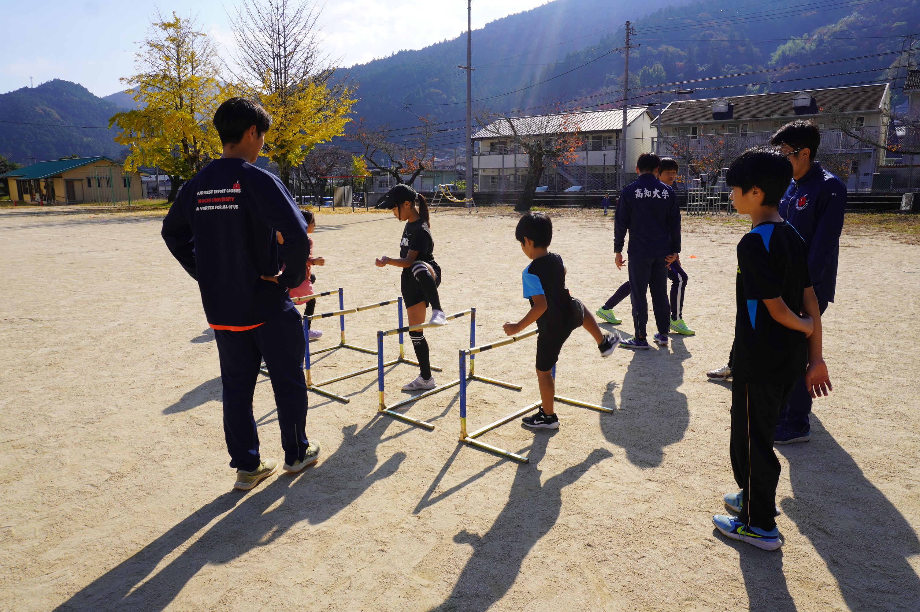 今回は第2弾として陸上教室を開催しました。この企画は本山町教育委員会から幅広い年齢層に人気のある陸上競技の教室をぜひ開催してほしいとの要望を受け、高知大学陸上競技部に打診したところ、学生たちが「ぜひお役に立ちたい!」と応えて準備をしてくれました。