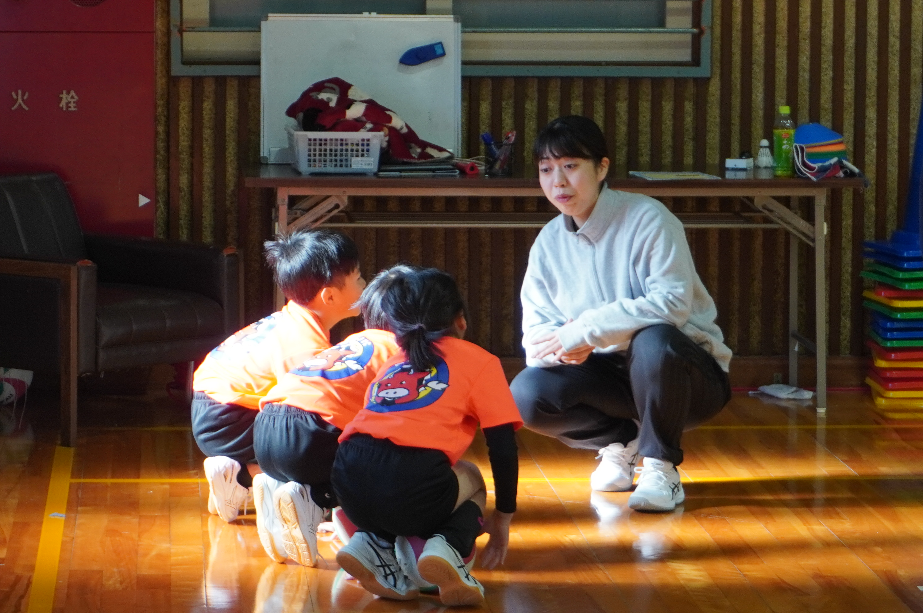 開会あいさつの後、小学生は女子大学生、中学生は男子大学生とそれぞれのコートに分かれ、小学生チームは自己紹介と好きなもの(こと)を全員が発表し、一方の中学生チームは全員で声を合わせてランニングでのアップから始まりました。その後基本練習に移り、最後は試合形式へと進んでいきました。最初は緊張していた小中学生も大学生のお兄さん、お姉さんの丁寧かつ優しい指導で、楽しく和気あいあいと取り組む姿が見受けられました。
