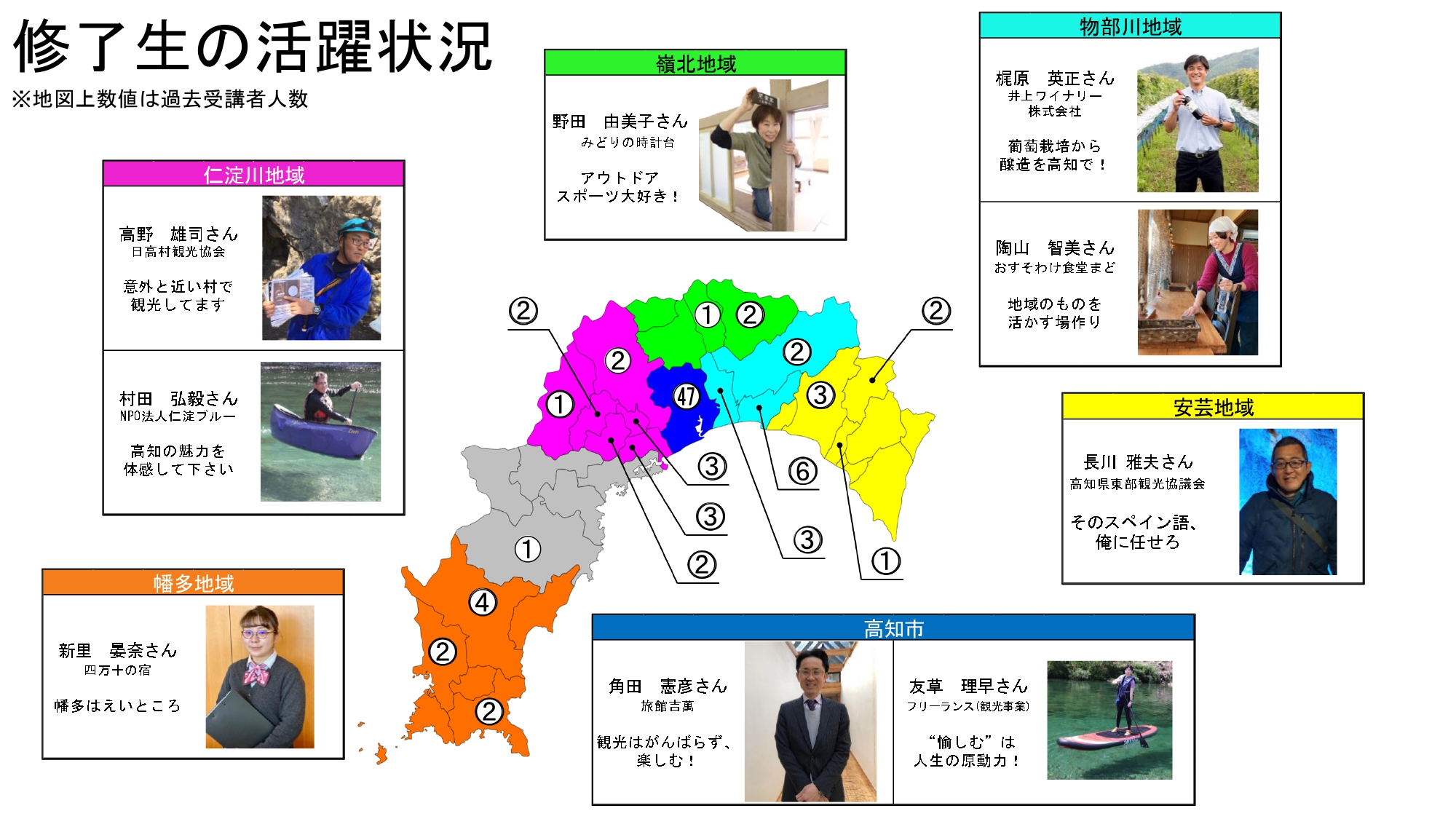 こうち観光カレッジは、県内・県外で活躍する観光地域づくりの実践者や高知大学の教員を講師として、観光地域づくりを実践的に学ぶプログラム内容となっています。