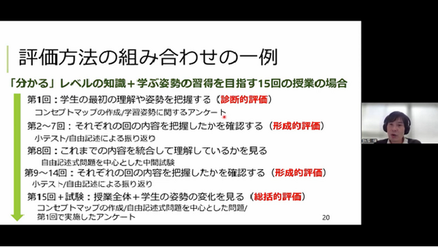 第2回:「実践編」と題した第 2 回では、まず前回の振り返りに加え、寄せられた質問についての回答 が行われた。 続いて、第 1 回で示した到達目標の分類別にどのような評価方法があるかについて、それぞれ 紹介が行われた。すなわち、文部科学省(2017)における「資質・能力の 3 つの柱」や石井(2015) の「知識・技能の 3 つのレベル」の分類に沿って、それぞれどのような評価方法があるかについ て文献に記載された事例をもとに紹介を行った。 さらに、授業の目標に応じ、15 回の授業の中でそれぞれの到達目標に適した評価をどのよう に組み合わせていくかといった例についても示された。