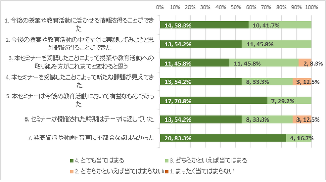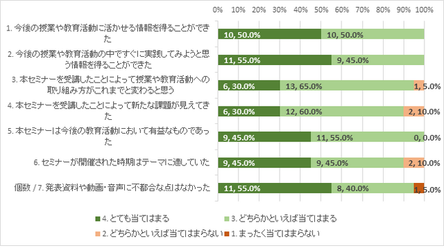 参加者アンケートを行った結果、「5. 本セミナーは今後の教育活動において有益なものであった」とい う設問において、第 1 回、第 2 回ともに全ての回答者から肯定的な回答 (「とても当てはまる」「どちら かといえば当てはまる」の合計) を得ることができた。また、他の設問においても回答者の大半から肯定 的な回答が得られた。