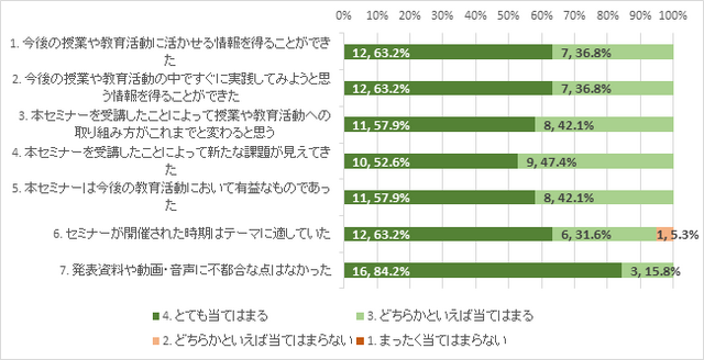 参加者アンケートを行った結果、「5. 本セミナーは今後の教育活動において有益なものであった」という設問において、第1回、第2回ともに全ての回答者から肯定的な回答 (「とても当てはまる」「どちらかといえば当てはまる」の合計) を得ることができた。また、他の設問においてもおおむね肯定的な回答が得られた。