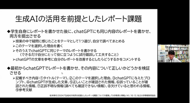 さらにChatGPTをはじめとする生成AIが急速に普及している現状を踏まえ、レポート課題における生成AIの不正な使用を防ぐにはどうするかについても講師から提案がなされた。その中には実際にChatGPTを活用して文章を作成させ、それについて学生が批評するといったものや、ChatGPTが生成した文章と学生自身で書いた文章について比較させるといったものがあった。他にも授業の中で学生にレポートの書き方について指導し、レポートに関する理解を深めることで学習意欲や学習成果を向上させるとともに不正を防ぐ一助となることが示された。