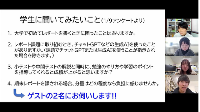 その後は実際の学生2名に参加してもらい、第1回で募集した学生に尋ねたい4つの質問の中から回答してもらった。学生からはテストの解説と同時に学習におけるポイントや重要な点を伝達されることで授業内容の理解が深まることや、大学で初めてレポートを執筆したさい、書き方が分からなかったり、授業によって提出方法や書式等が違うことで困惑したりしたといった、自身の経験にもとづいた意見が出された。またコメンテーターとして登壇した塩川 奈々美 先生からは、教養教育の授業内で実施したアンケート(n=28)の結果についても紹介があった。その後は参加者から匿名で質問を投稿することができるLearnWiz Oneを活用して質問を受け付け、学生視点からの意見を踏まえながら議論や質疑応答がなされた。