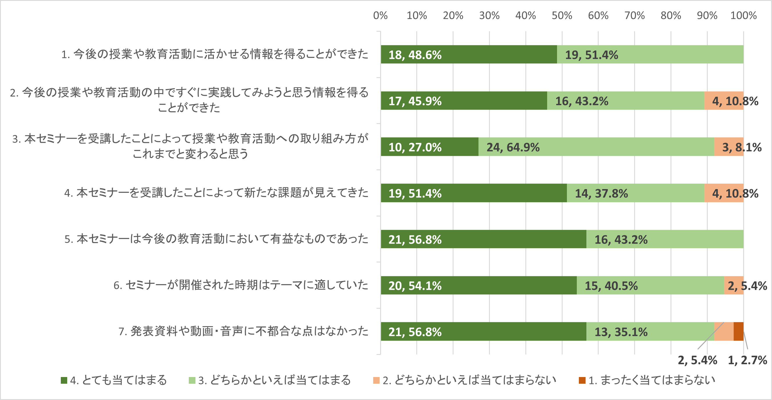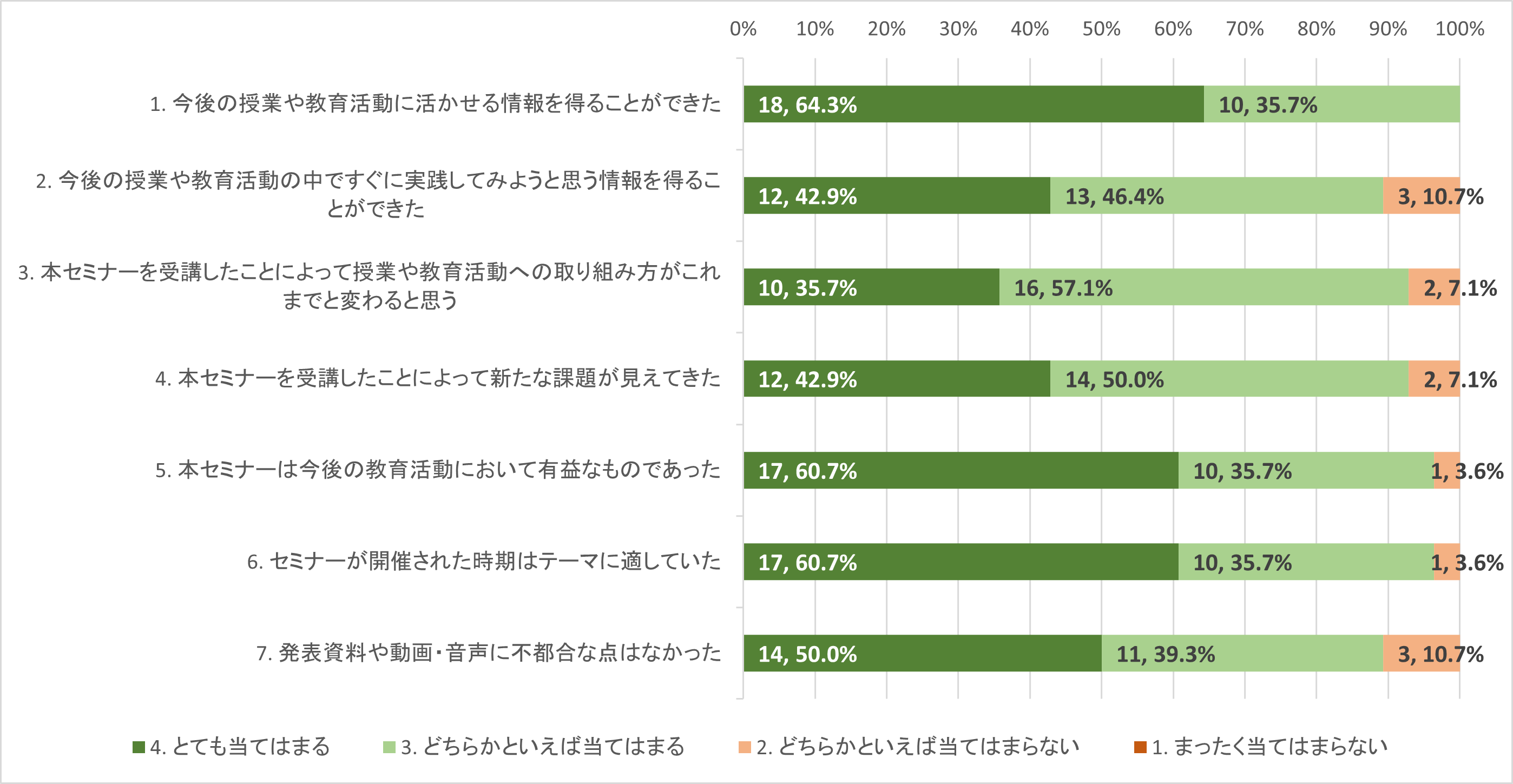 参加者アンケートを行った結果、「5. 本セミナーは今後の教育活動において有益なものであった」という設問において、第1回、第2回ともにほとんどの回答者から肯定的な回答 (「とても当てはまる」「どちらかといえば当てはまる」の合計) を得ることができた。また、他の設問においてもおおむね肯定的な回答が得られた。