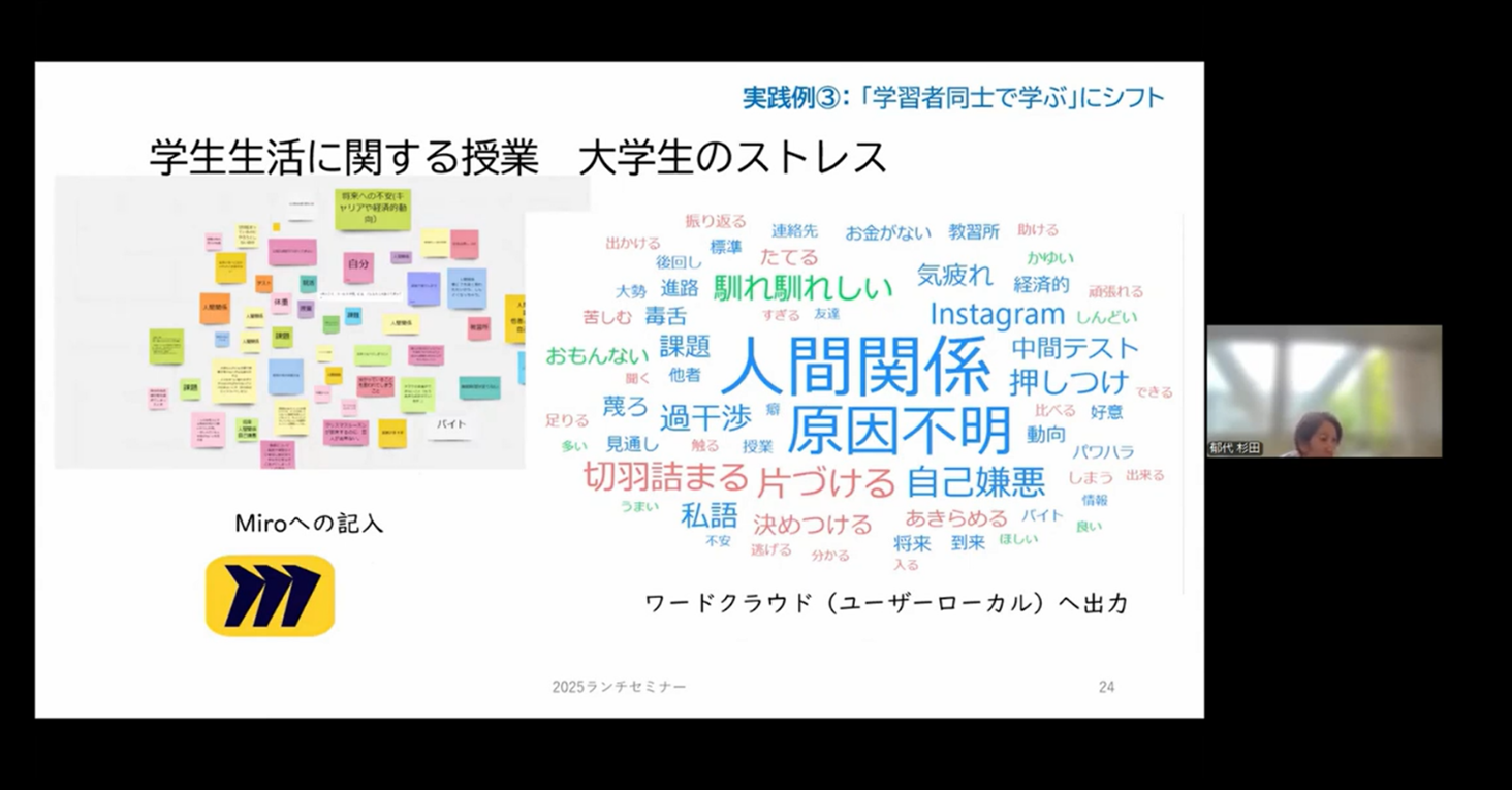 その後、オンデマンド授業においてアクティブラーニングを促すための方法と実践例として、様々なオンラインツールを用いた工夫が講師から紹介された。その中には付せんツールmiro(https://miro.com)のワードクラウド機能を使って意見の違いを可視化したり、オンライン上でのプレゼンとコメントを行うことで学生のコミュニケーションを促す活動の設計や、Padlet(https://ja.padlet.com/)を用いて発表形式を動画やスライド等様々な形の提出を許可することで課題を「学習者の選択の余地がある」ものとする、slido(https://sli.do/)によって学生の意見を収集する、大学のLMSに動画教材とテキストデータ、小テストを組み合わせた教材をアップロードするといった、いずれも講師が自身の授業で実践しているものが挙げられた。