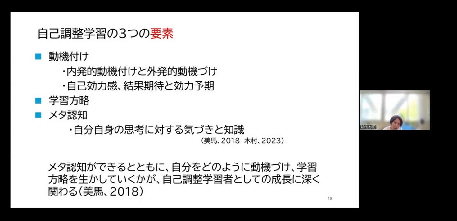 続いてオンデマンド型授業において自己調整学習を促すために求められる要素として、形成的評価の実施、他者と関わる学び合いの機会を設定すること、分からない部分を質問できるといった援助要請がしやすい環境を作ることの3つが講師から提示された。