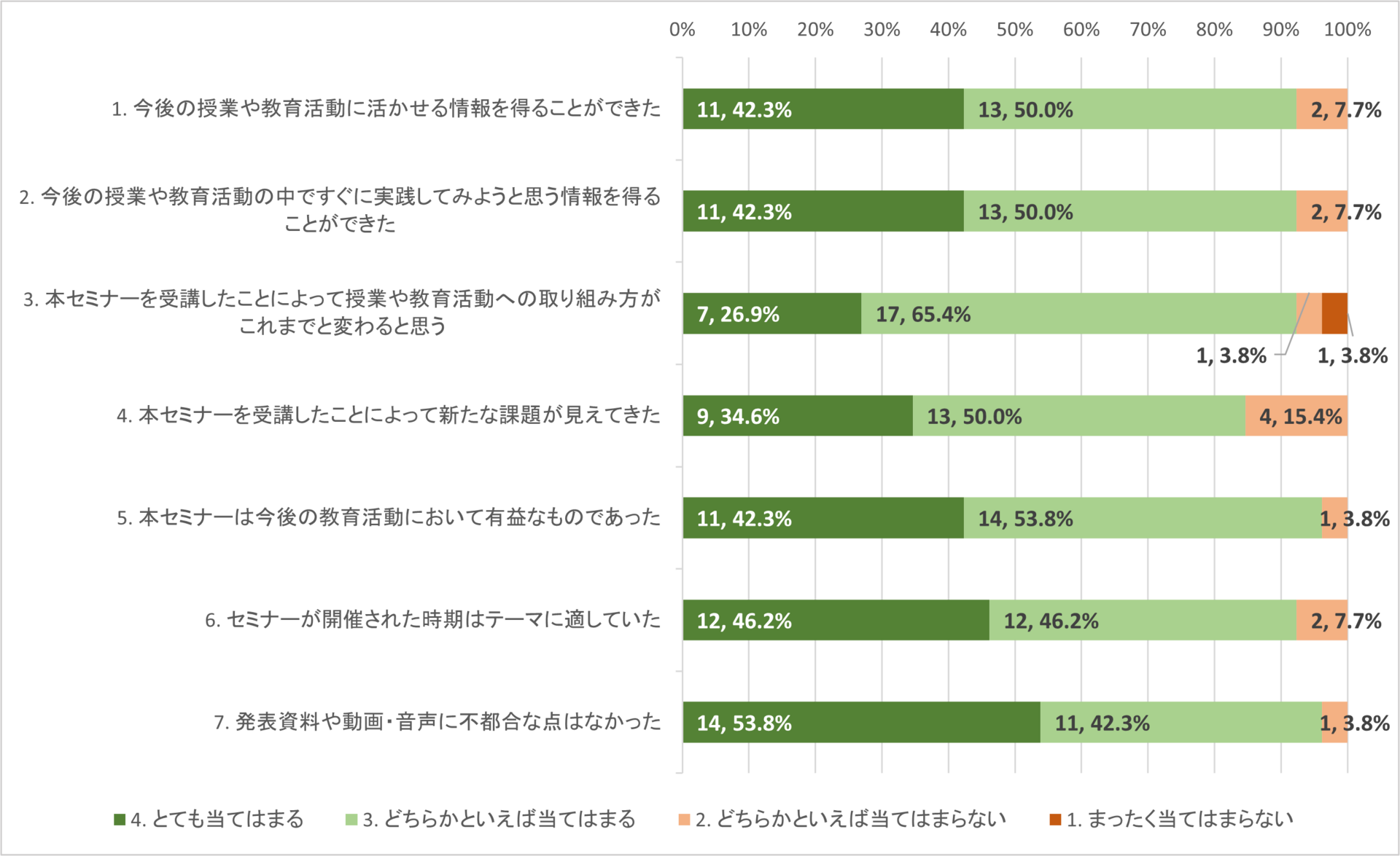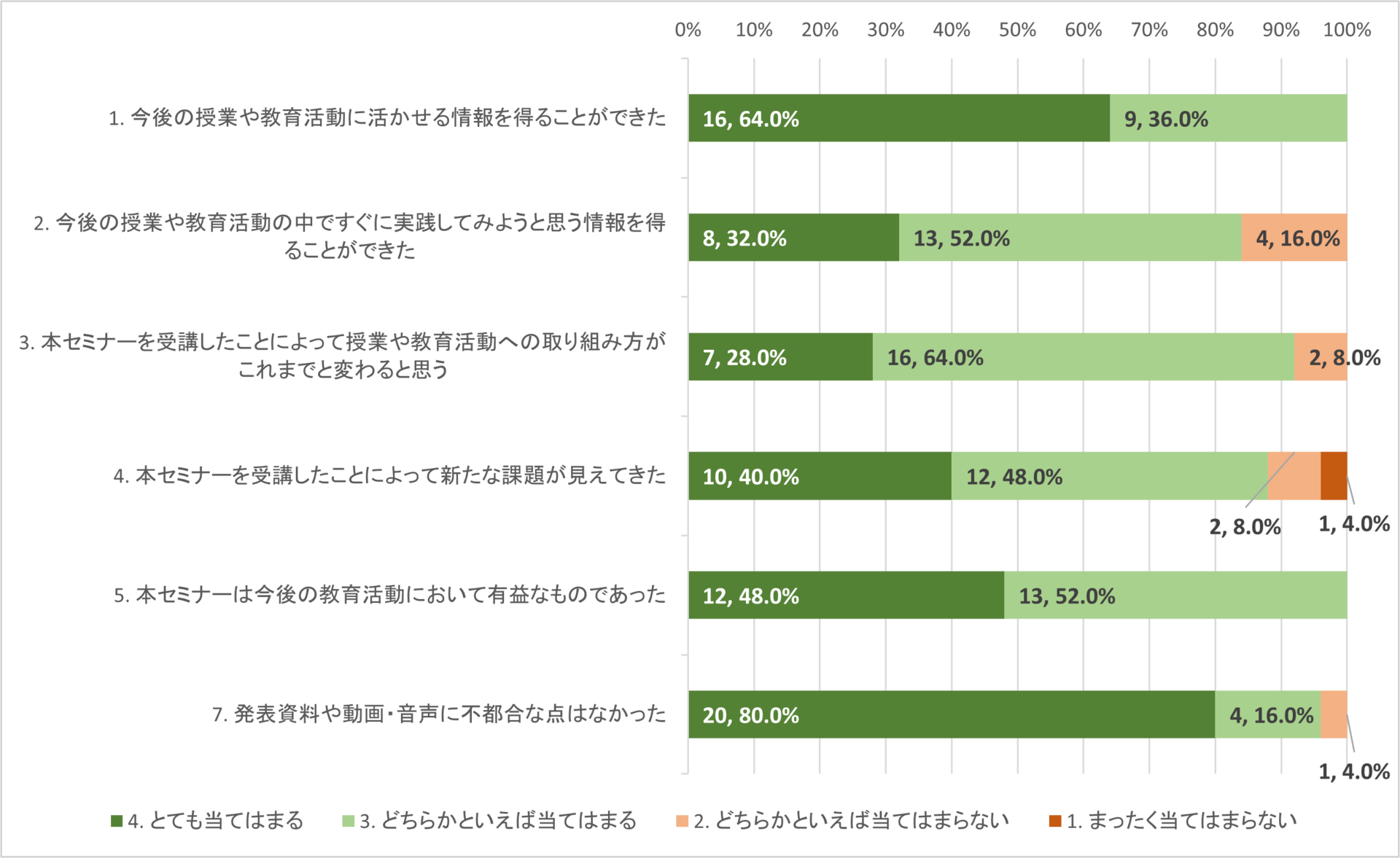 参加者アンケートを行った結果、「5. 本セミナーは今後の教育活動において有益なものであった」という設問において、第1回、第2回ともにほとんどの回答者から肯定的な回答 (「とても当てはまる」「どちらかといえば当てはまる」の合計) を得ることができた。また、他の設問においてもおおむね肯定的な回答が得られた。