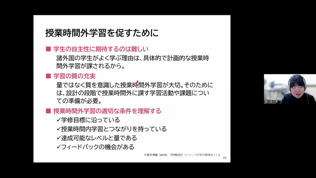 そのような中で、授業時間外学習を促すためには、学生の自主性のみに期待するのではなく、あらかじめ授業とのつながりを考慮して設計した課題を提示すること、すなわち授業設計の段階からの十分な検討が必要であることが示された。とくに理解しておくべき授業時間外学習の適切な条件として、①学修目標に沿っている、②授業時間内学習とつながりを持っている、③達成可能なレベルと量である、④フィードバックの機会がある、の4点が挙げられた。またこれを踏まえた授業時間外学習の促進の方法の第1として、シラバスに必要な授業時間外学習の方法・時間について明記することが提示された。