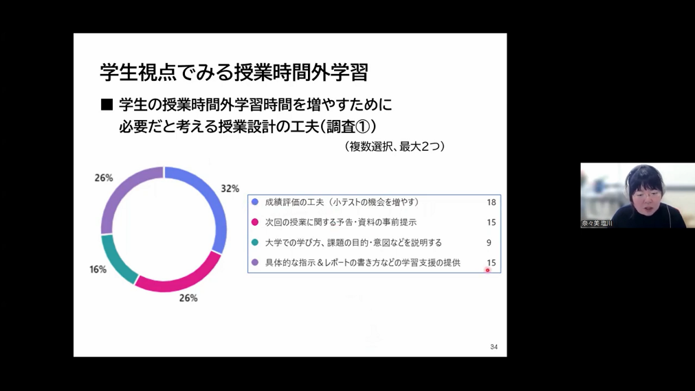 さらに、講師が実施した学生への授業時間外学習に関する意見調査の結果についても報告が行われた。その中でも授業時間外学習を増やすために必要だと学生が考える授業設計の工夫として、小テストを増やす等の成績評価の工夫や授業資料の事前提示、学習方法および課題の目的や意図といった具体的な指示、さらにはレポートの書き方等に関する支援の実施といったものが挙げられた。また授業課題へのフィードバックがある授業に対しては、そうでない授業よりもやりがいがあると答えた学生が多かったといった結果も紹介された。
