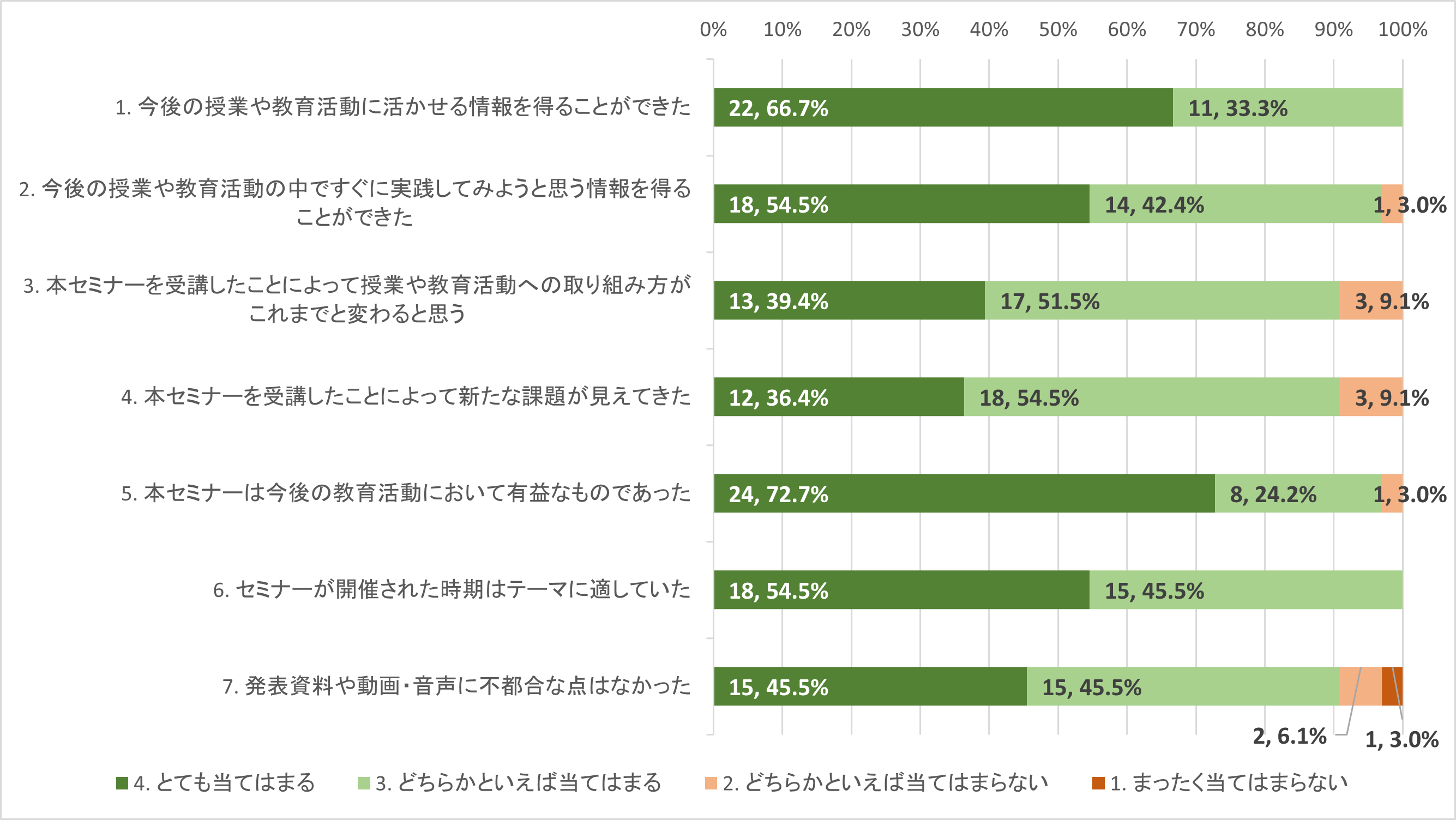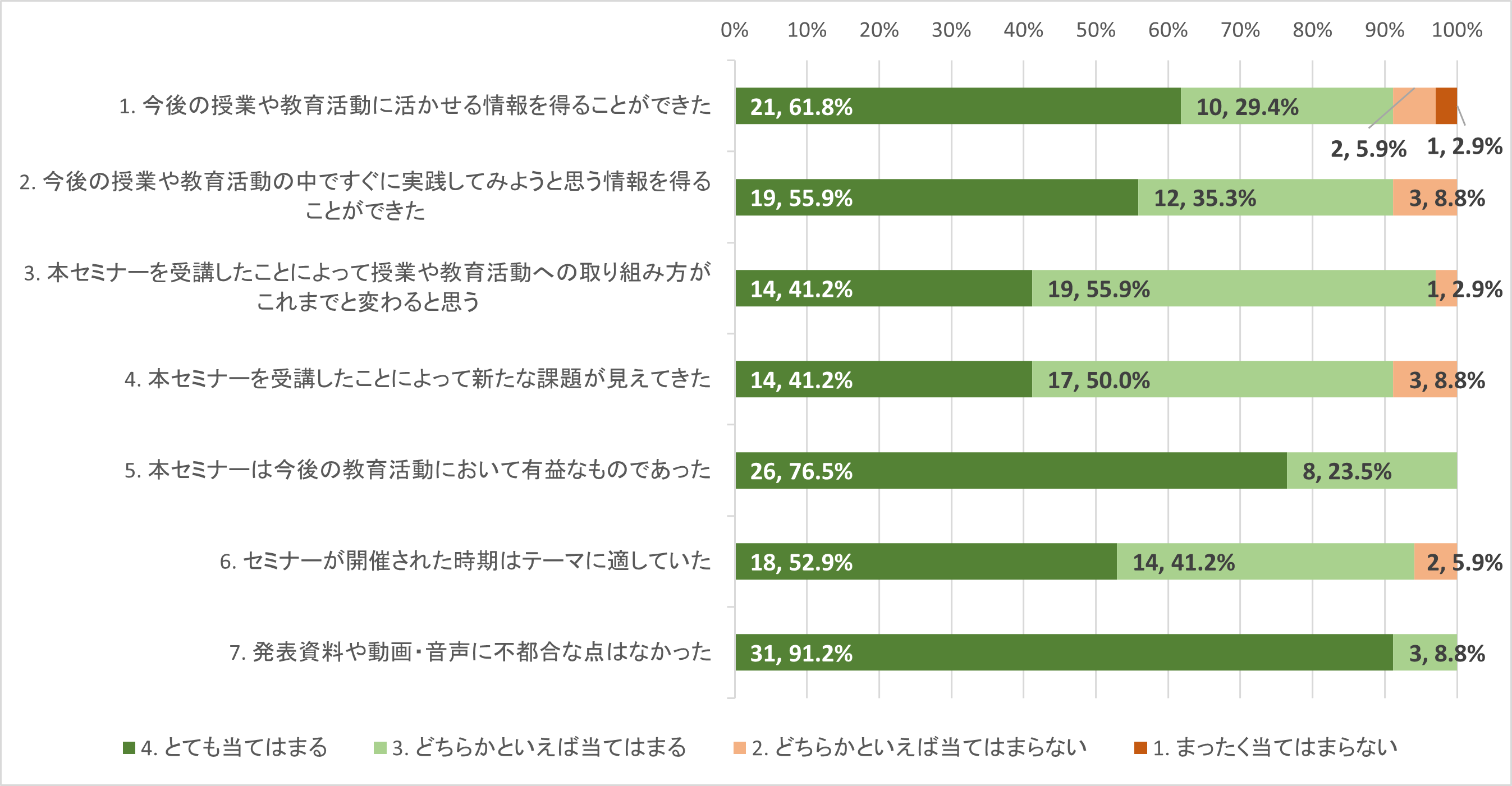 参加者アンケートを行った結果、「5. 本セミナーは今後の教育活動において有益なものであった」という設問において、第1回、第2回ともにほとんどの回答者から肯定的な回答(「とても当てはまる」「どちらかといえば当てはまる」の合計)を得ることができた。とくに第1回では、すべての回答者から肯定な回答が得られた。また、他の設問においても同様におおむね肯定的な回答が得られた。