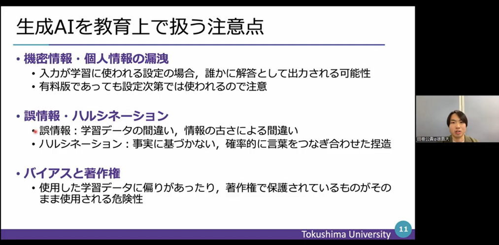 まず、生成AIは学習したデータをもとに確率的に推論して文章を出力する仕組みであり、そのため生成AIを教育において扱う際には「機密情報・個人情報の漏洩」「誤情報・ハルシネーション」「バイアスと著作権」の3つに注意することが必要であることが説明された。