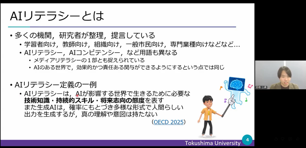 AIリテラシーはこれからの生成AIが一般化した社会において必要なリテラシーであり、近年になって多くの機関・研究者によって提言がなされている。その中でも今回は講師からOECDによる一般市民が身につけるAIリテラシー、ならびにUNESCOによる教師および学習者が身につけるAIリテラシーについて紹介がなされた。