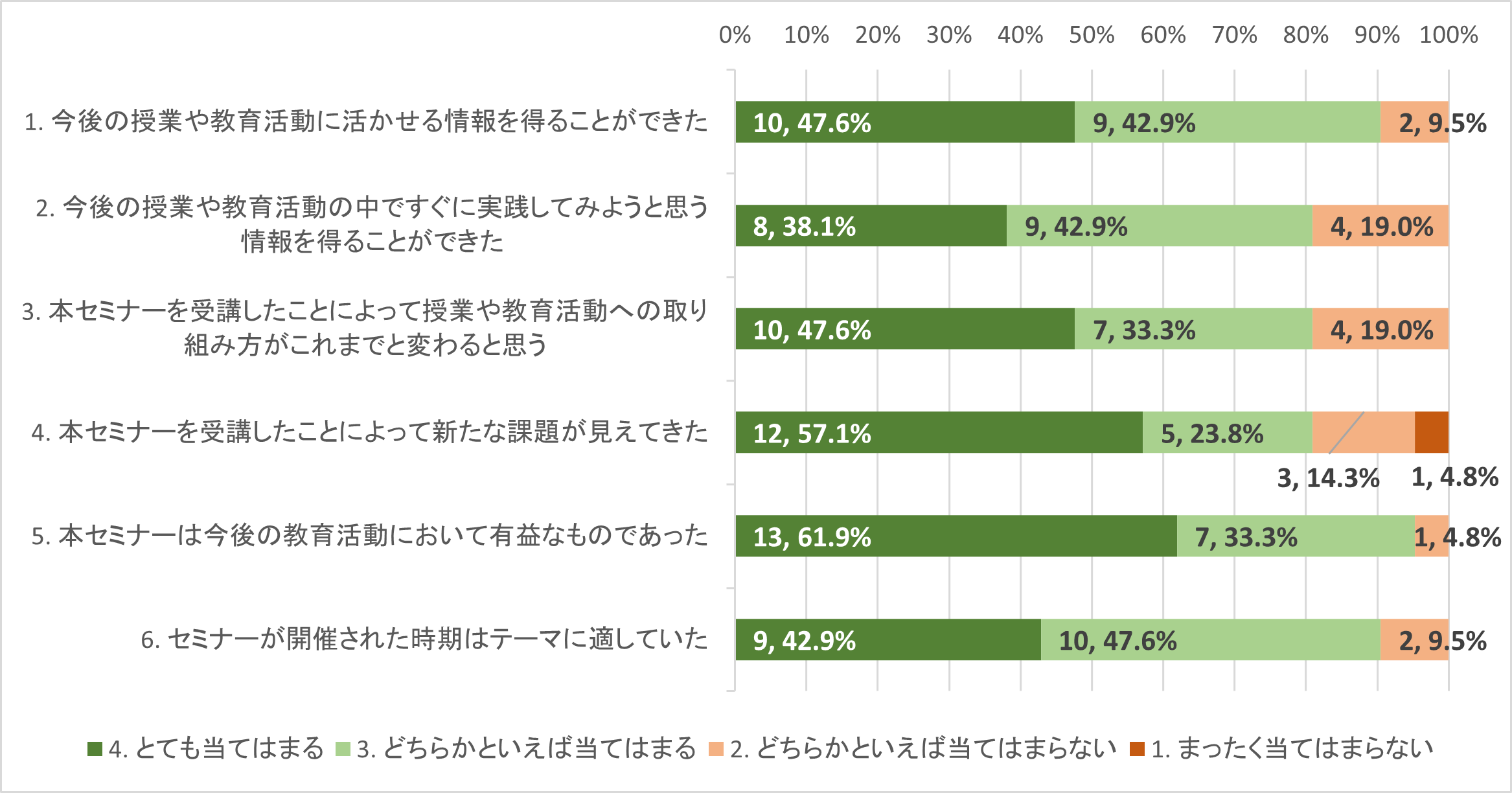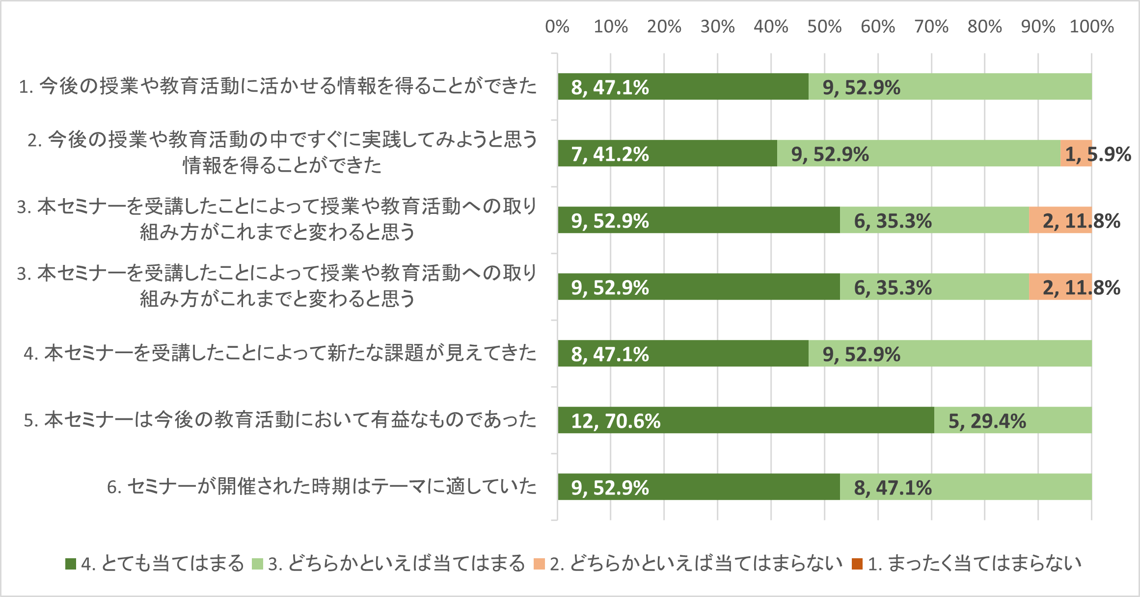 参加者アンケートを行った結果、「5. 本セミナーは今後の教育活動において有益なものであった」という設問において、第1回、第2回ともにほとんどの回答者から肯定的な回答(「とても当てはまる」「どちらかといえば当てはまる」の合計)を得ることができた。とくに第2回では、すべての回答者から肯定な回答が得られた。また、他の設問においても、いずれの回でほぼ肯定的な回答が得られた。