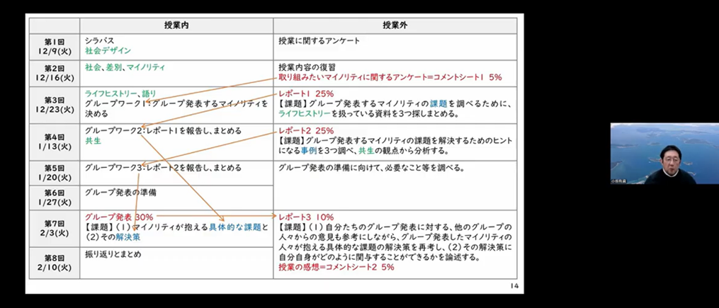 まず、マイノリティの人々が生きやすい社会をデザインするという、デザイン思考の習得を組み入れた授業「社会デザインとマイノリティ問題」について解説が行われた。この授業は全8回中最初の4回でマイノリティの人々が抱えている課題を発見し、続く4回でその課題に対する対策や、その対策についての自分の関わり方を考えるという構成になっている。それぞれの回では個人で行う授業外の課題をもとに授業内でグループワークを実施するという形をとり、学生がなぜ授業外学習を行うのかを意識づけながら実施されていることが示された。さらに各回でグループワークがどのように行われるかについても、使用しているツールや具体的な課題内容に言及しながら解説が進められた。