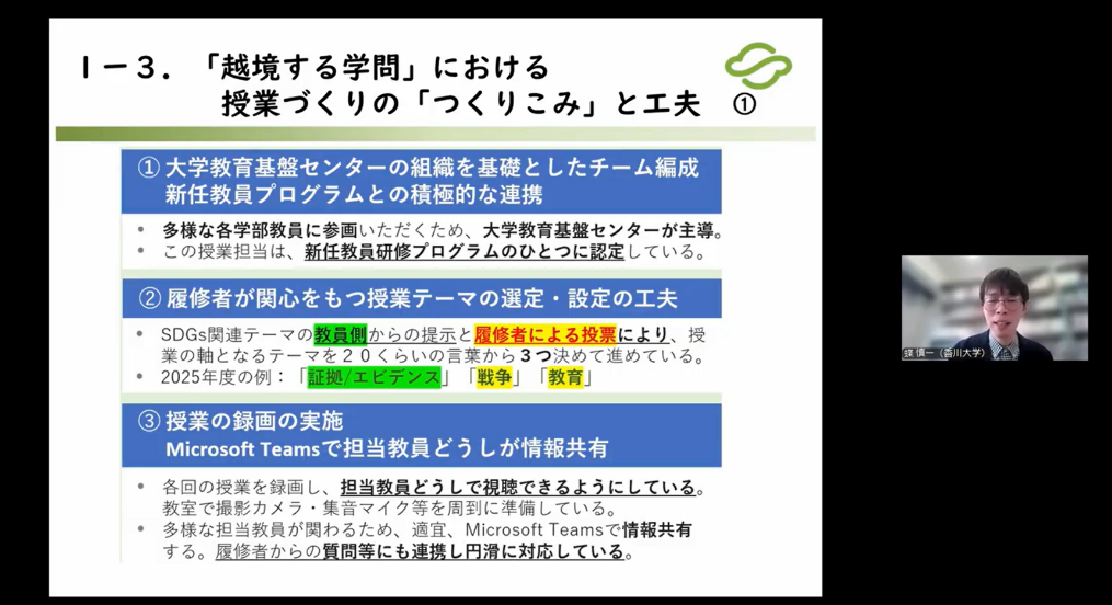 「越境する学問」は6つの分野の教員がそれぞれ自身の専門分野にもとづいた授業を行うことで、大学に入学したばかりの学生が様々な学問の意義を知り、大学での自身の学びをプロデュースする(=「学びの構えを転換する」)ことを目的とした科目である。この授業は大学教育基盤センターが主導しており、各分野の教員が参加・協力して授業が設計されているなっている。また多様な背景をもつ教員同士の交流にもつながることから、香川大学における新任教員研修プログラムにも認定されている。また、多様な分野にもとづく授業が展開される中で、各回の統一性をもたせるために、各回では学生・教員双方から選定された3つのテーマにもとづく授業が実施されるといった工夫も紹介された。さらに授業の模様を録画して各教員が授業の様子を共有できるようになっているほか、各種ICTツールを積極的に授業に導入していることも示された。