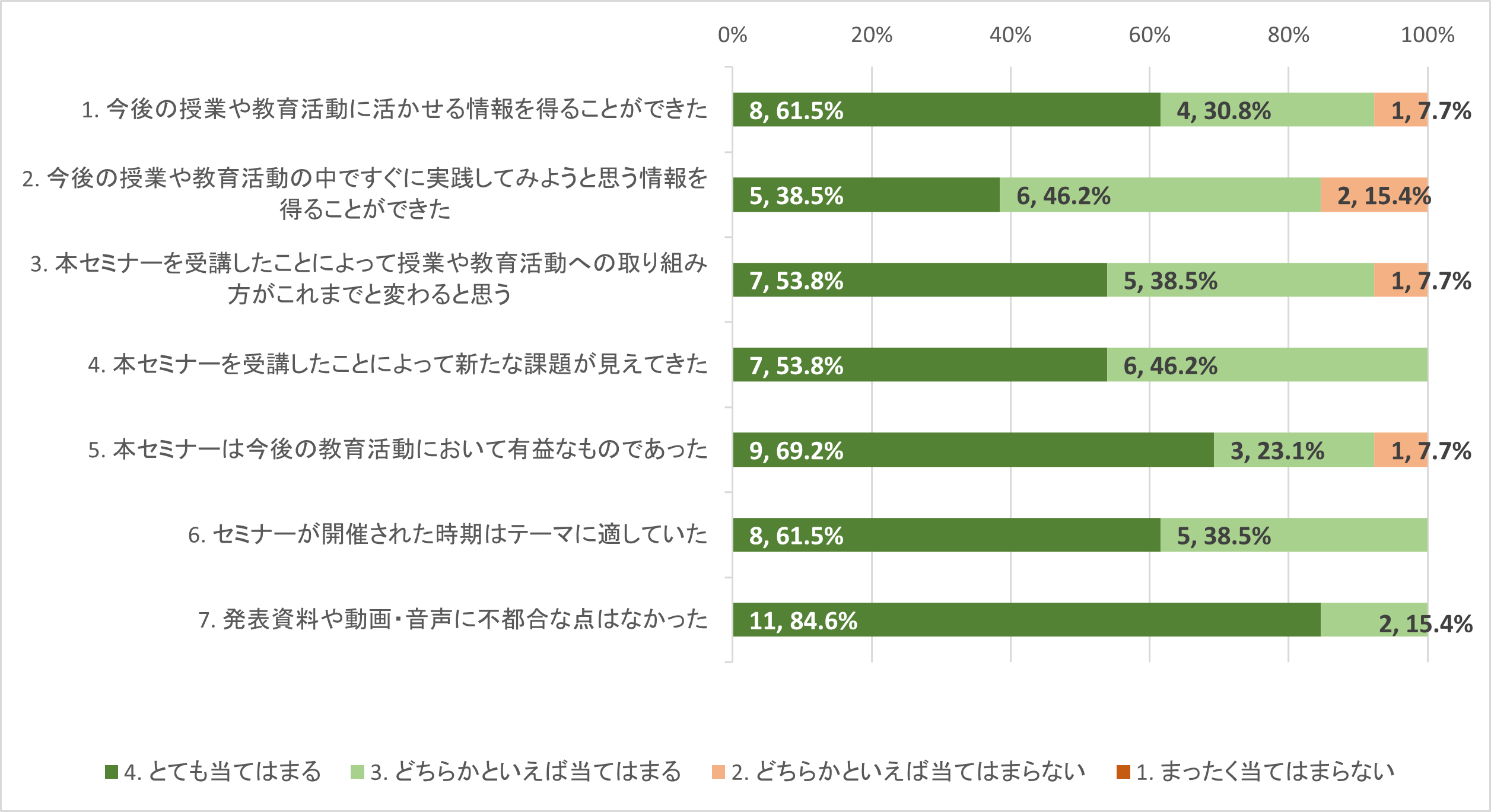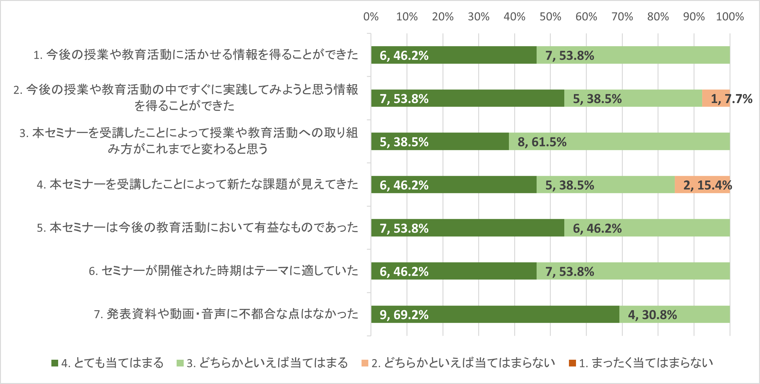 参加者アンケートを行った結果、「5. 本セミナーは今後の教育活動において有益なものであった」という設問において、第1回、第2回ともにほとんどの回答者から肯定的な回答(「とても当てはまる」「どちらかといえば当てはまる」の合計)を得ることができた。とくに第2回では、すべての回答者から肯定な回答が得られた。また、他の設問においても、いずれの回でほぼ肯定的な回答が得られた。