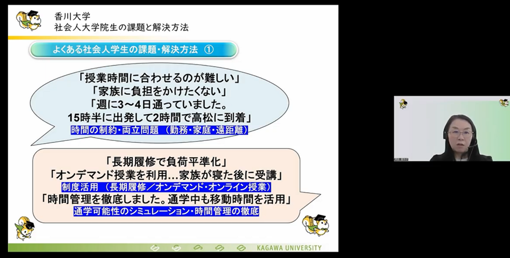 続いて、講師からは香川大学における社会人大学院生の現状が示された。社会人がどのような動機で大学院に進学し、キャリアにどのように活かしているかについて事例を挙げて紹介されたほか、社会人大学院生の実際の声を紹介しながら大学院への進学動機や学修にどのような課題があるかについて報告された。