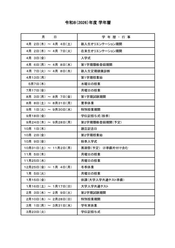 創立記念日(10月1日)※ただし、年度によって創立記念日に授業を行うことがあります。
