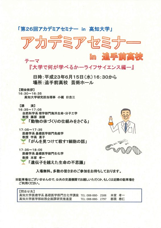 第26回アカデミアセミナーin高知大学 『大学で何が学べるか-ライフサイエンス編-』 を、追手前高校にて、主に高校生を対象として開催いたします。 入場無料、多数の皆さまのご参加をお待ちしております。