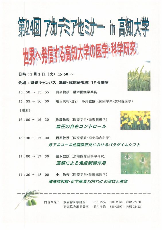 平成23年3月1日(火)、岡豊キャンパス 基礎・臨床研究棟 1F 会議室において、アカデミアセミナー IN 高知大学「世界へ発信する高知大学の医学・科学研究」が開催されます。