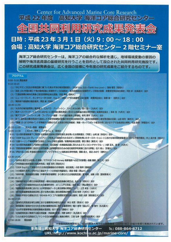 On Tuesday, March 1, 2011, the Kochi University Marine Core Comprehensive Research Center will hold its "National Joint Research Results Presentation" for the 2010 academic year.