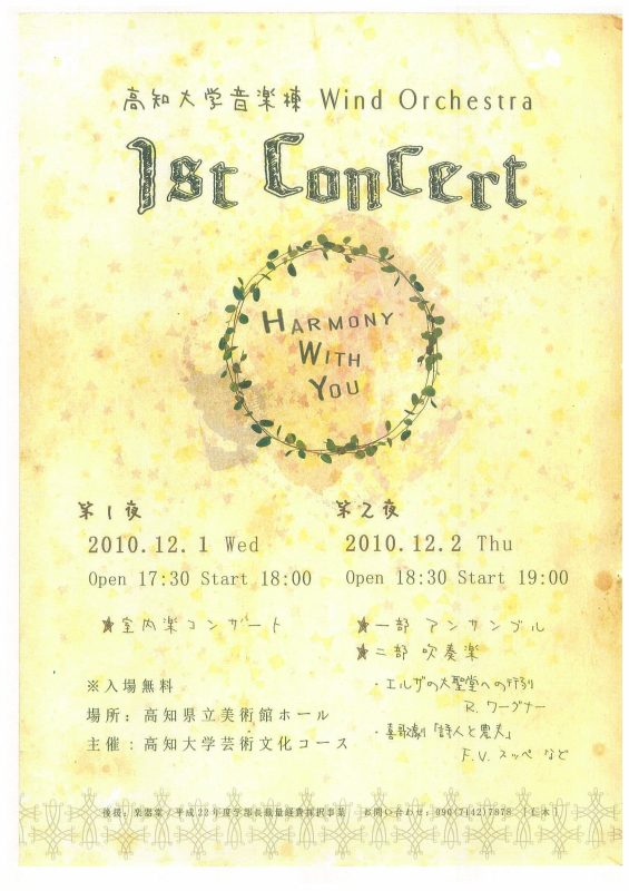 平成22年12月1日(水)、2日(木)の両日、高知県立美術館ホールにおいて、教育学部生涯教育過程芸術文化コースの学生たちによる室内楽、吹奏楽の演奏会が行われます。