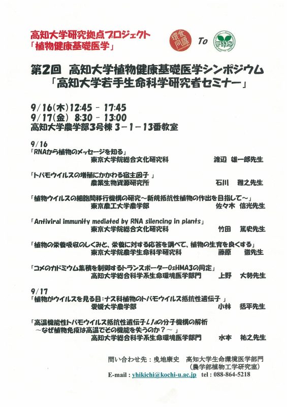 平成22年9月16日(木)・17日(金)の両日、高知大学農学部3号棟3-1-13番教室において、第2回高知大学植物健康基礎医学シンポジウム「高知大学若手生命科学研究者セミナー」が開催されます。