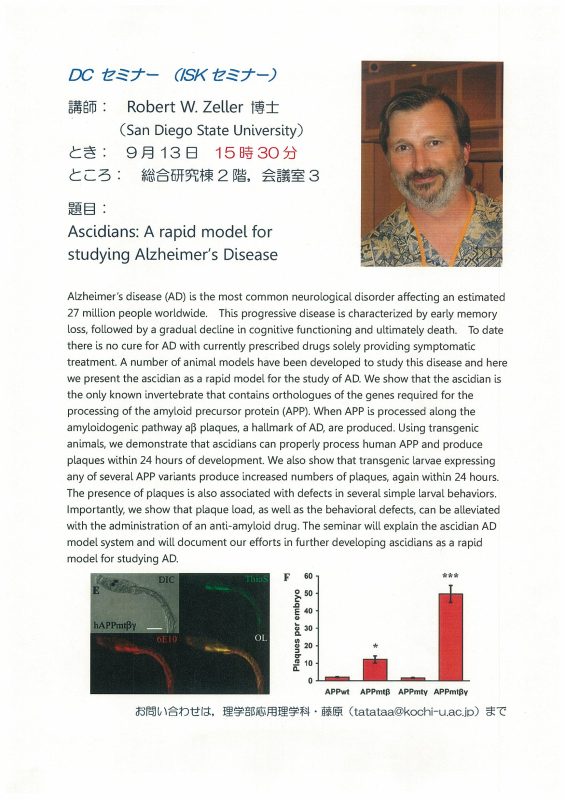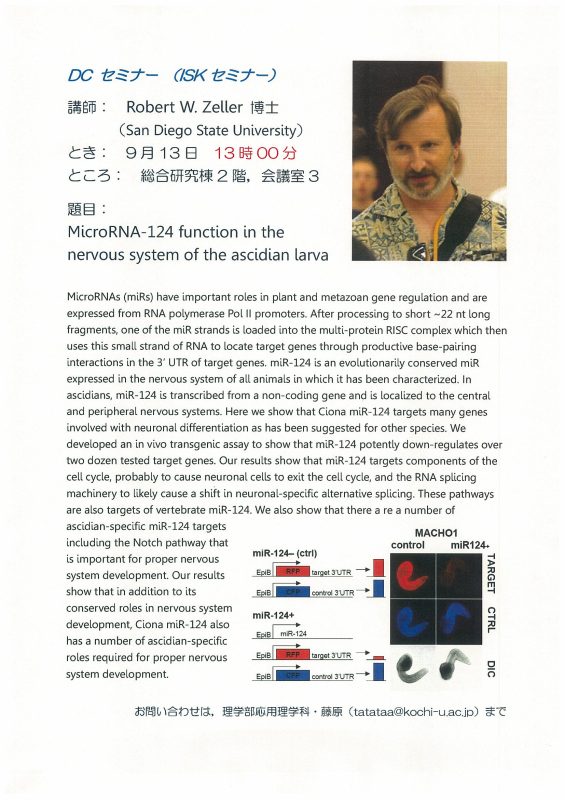 平成22年9月13日(月)、朝倉キャンパス総合研究棟において、サンディエゴ州立大学の Robert W.Zeller 氏を講師に迎え、DCセミナー(ISKセミナー)が開催されます。