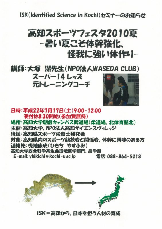 平成22年7月17日(土)、講師に大塚 潔氏(NPO法人WASEDA CLUB)迎え、「高知スポーツフェスタ2010夏」を開催します。