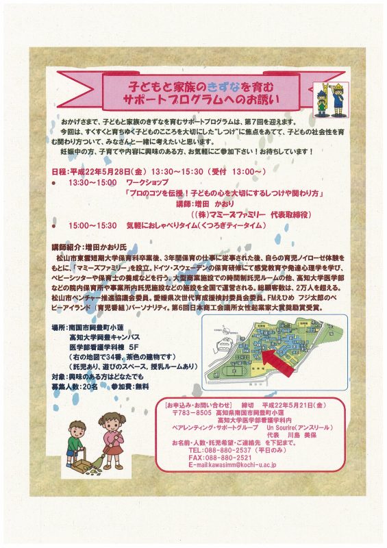 On Friday, May 28, 2010, the "7th Support Program for Fostering Bonds Between Children and Families" will be held in the Nursing Department Building on the Okayama-Toyo Campus.