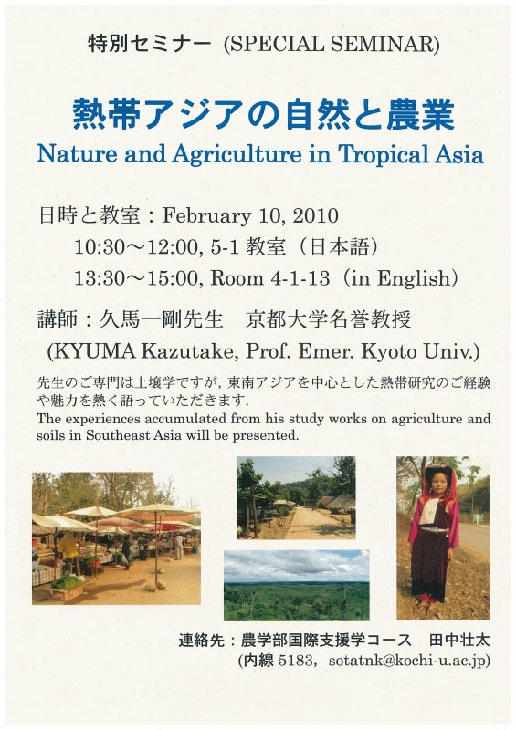 平成22年2月10日(水)に農学部国際支援学コースセミナーが京都大学名誉教授 久馬一剛氏を講師に迎え、「熱帯アジアの自然と農業」と題して開催されます。