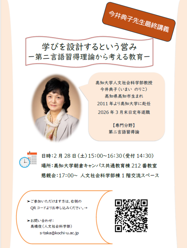 We will be holding Professor Noriko Imai’s final lecture, “The Practice of Designing Learning: Education from the Perspective of Second Language Acquisition Theory.”