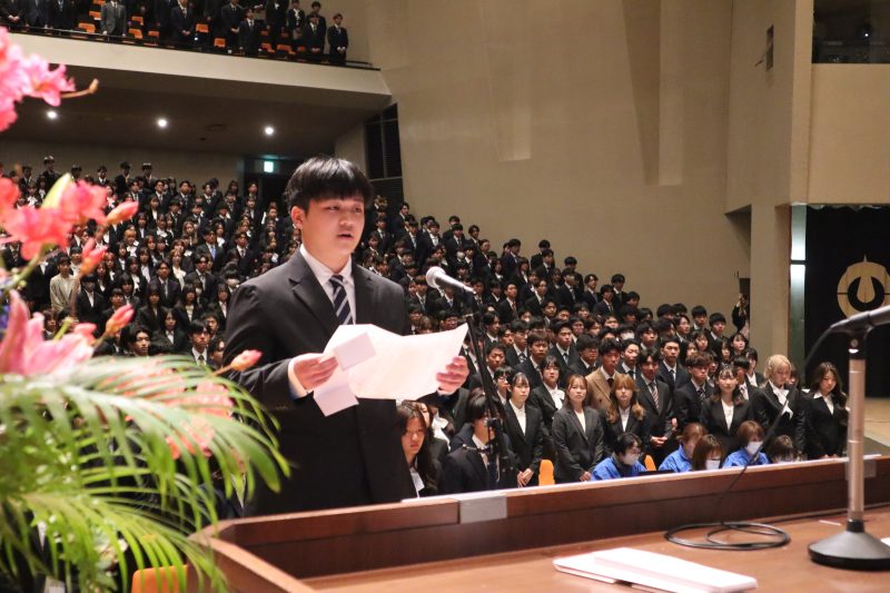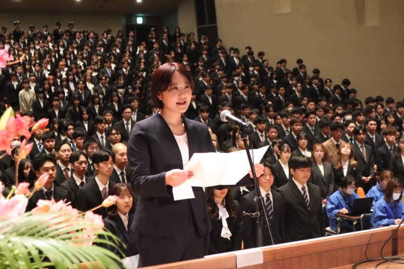 受田浩之学長の告辞に続き、秦泉寺楽さん(農林海洋科学部)と竹下菜々美さん(応用自然科学専攻)が新入生を代表して宣誓を行いました。