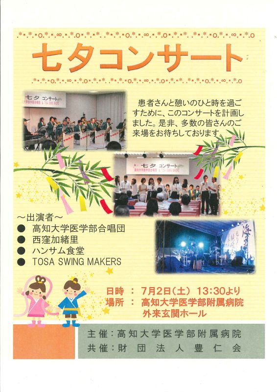 出演者は、TOSA SWING MAKERS、西窪加緒里助教(耳鼻咽喉科)、ハンサム食堂(県内で活動しているバンド)、医学部合唱団の皆さんです。