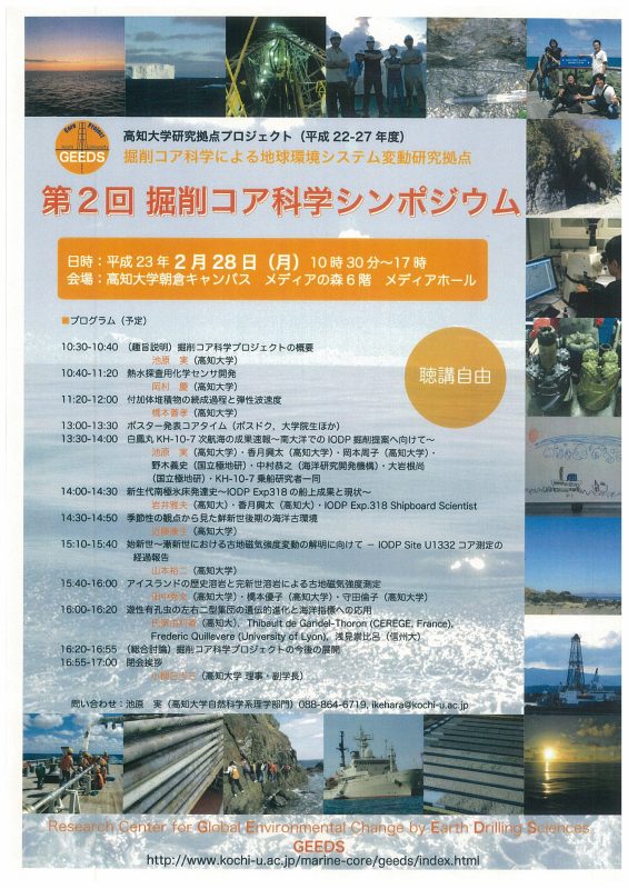 平成23年2月28日(月)、高知大学研究拠点プロジェクト「掘削コア科学による地球環境システム変動研究拠点」第2回掘削コア科学シンポジウムが開催されます。