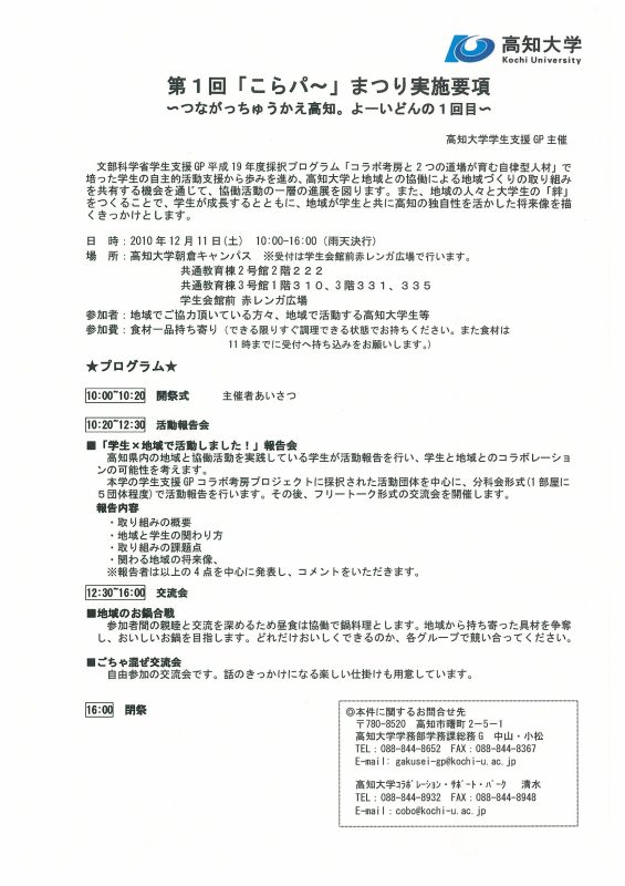 平成22年12月11日(土)、高知大学学生支援GP事業の一環として、第1回「こらパ~」まつりが開催されます。