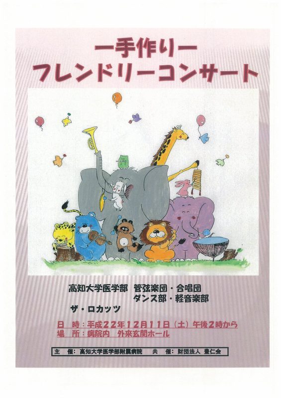 平成22年12月11日(土)、医学部附属病院において、入院患者さんの慰安を目的とする「フレンドリーコンサート」が行われます。今年で21回目になる「フレンドリーコンサート」には、医学部学生サークルの管弦楽団・合唱団・ダンス部・軽音楽部などが出演します。