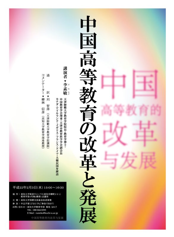 平成22年2月3日(水)、平成21年度国際交流基金助成事業として、天津師範大学教育学院院長 李素敏氏による講演会「中国高等教育の改革と発展」を開催します。