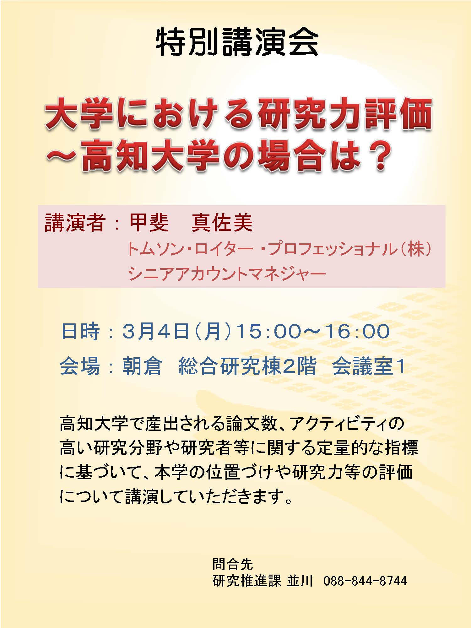 平成25年3月4日、トムソン・ロイター ・プロフェッショナル(株)シニアアカウントマネジャー 甲斐 真佐美氏をお招きし、特別講演会「大学における研究力評価 ~ 高知大学の場合は?」を開催します。