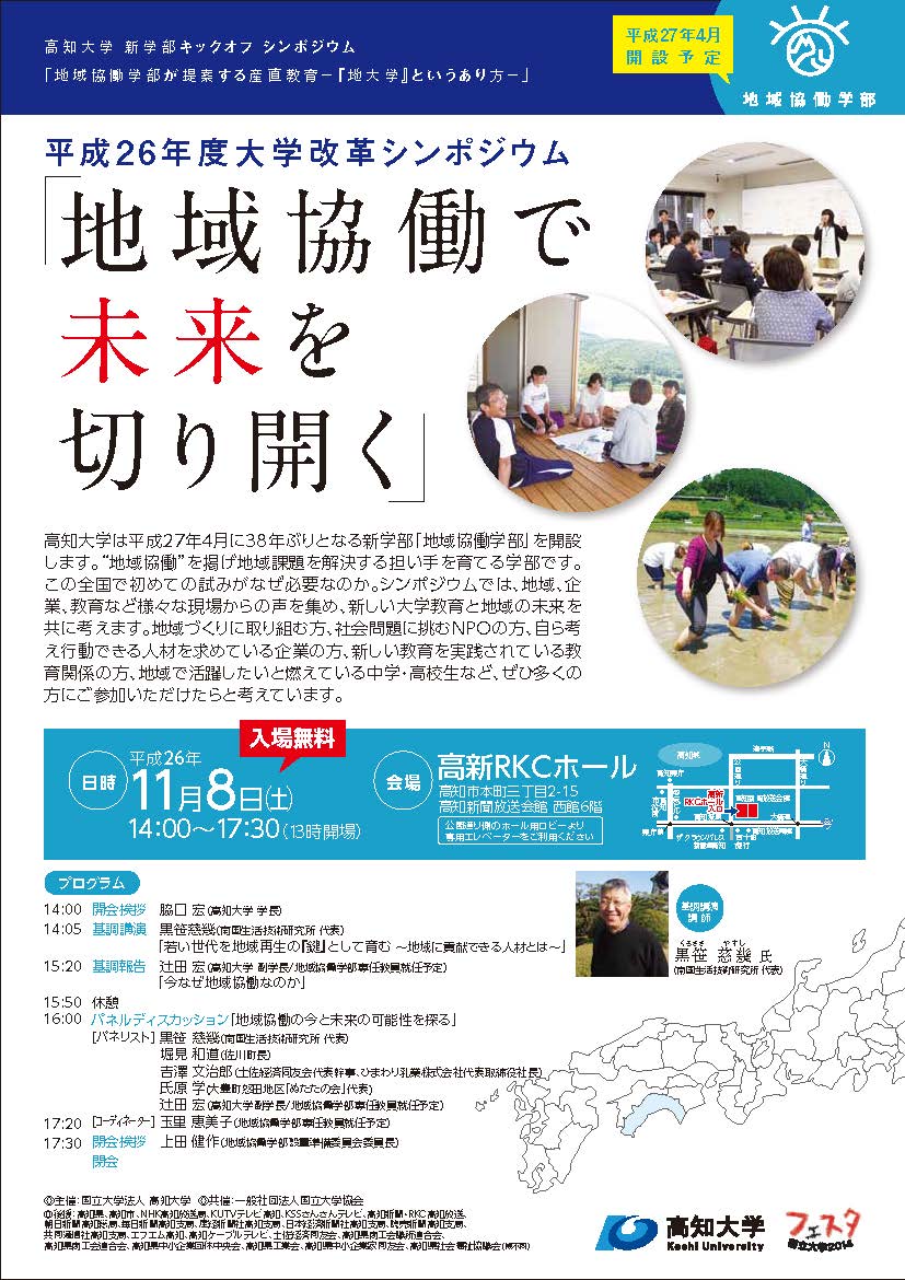 高知大学は平成27年4月に38年ぶりとなる新学部「地域協働学部」を開設予定です。“地域協働”を掲げ地域課題を解決する担い手を育てる学部です。この全国で初めての試みがなぜ必要なのか。シンポジウムでは、地域、企業、教育など様々な現場からの声を集め、新しい大学教育と地域の未来を共に考えます。