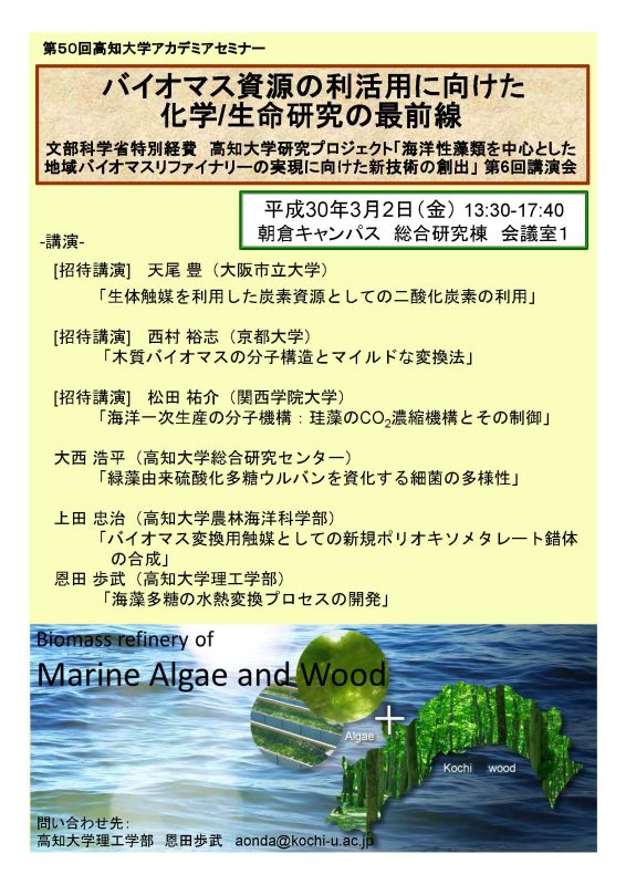 平成27年度から実施している高知大学分野横断的研究プロジェクト「海洋性藻類を中心とした地域バイオマスリファイナリーの実現に向けた新技術の創出」第6回講演会を開催します。