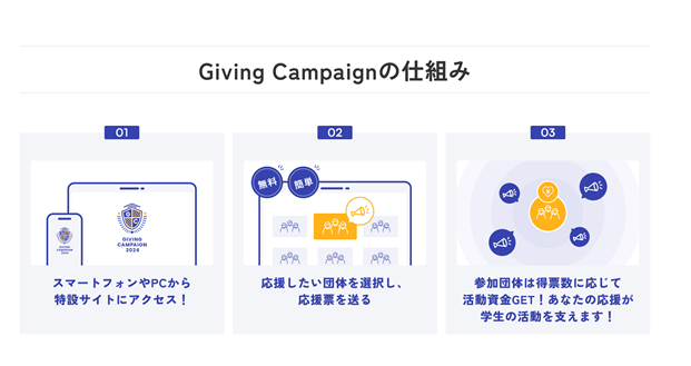 Giving Campaignは、2021年に始まったオンラインイベントで、今回が5回目の開催になります。参加する学生団体は、イベント期間中に活動についてSNSやOBOGネットワークに発信し、応援と寄付を募ります。